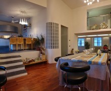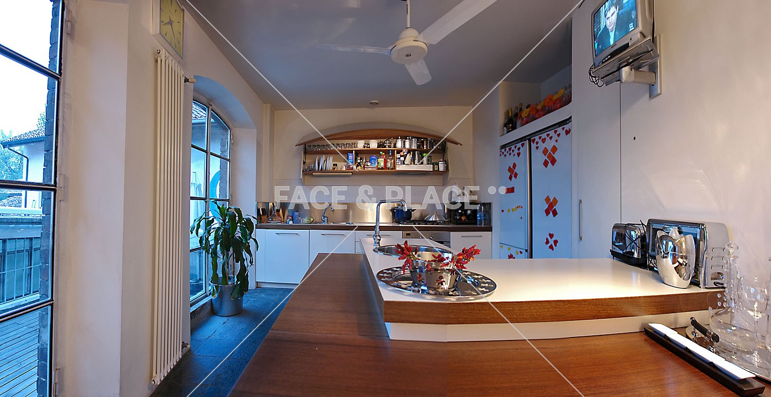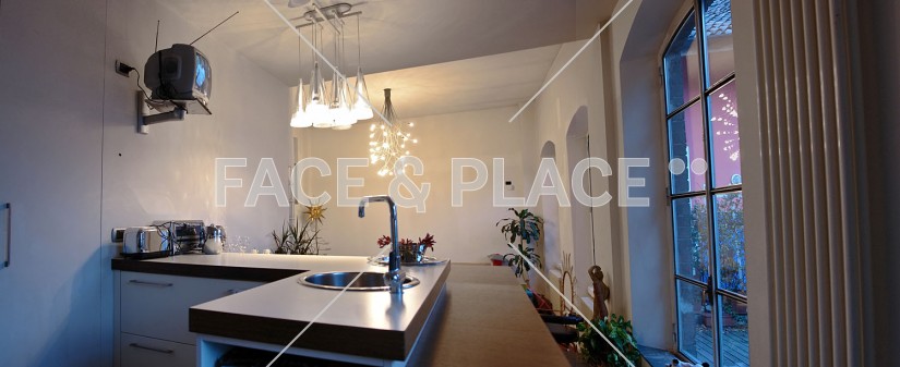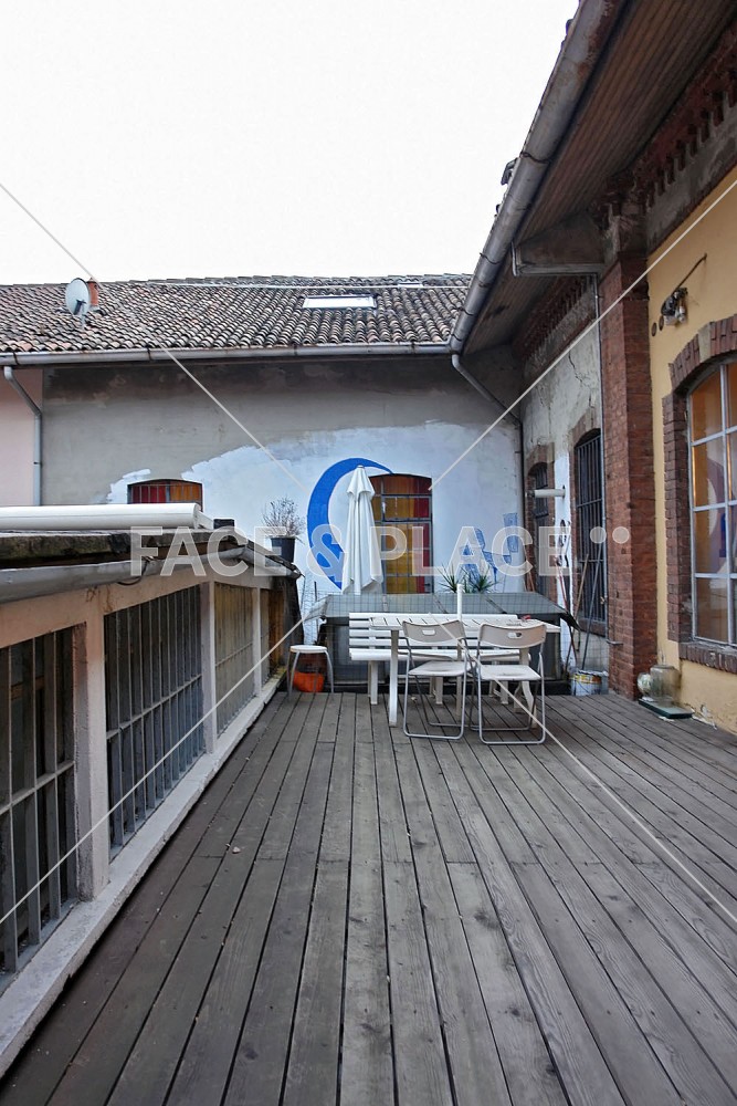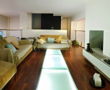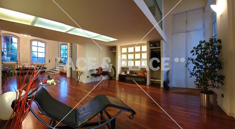 Modern house converted from an industrial space. Open space, modern decor and design. Large neon light define the spaces. Large windows look out onto a terrace with wooden floor.