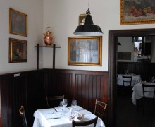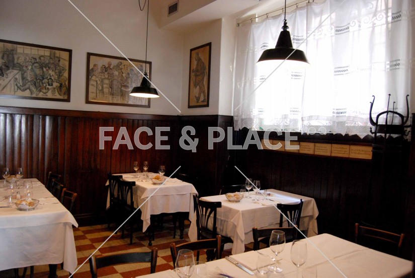 Trattoria rustica in centro città. Pavimenti e arredi originali di inizio Novecento. Ambiente molto luminoso, dove i colori principali sono il marrone scuro del legno e il bianco delle pareti.