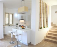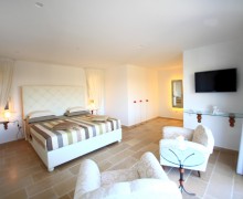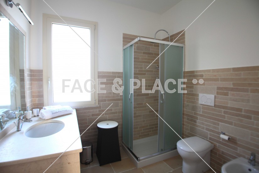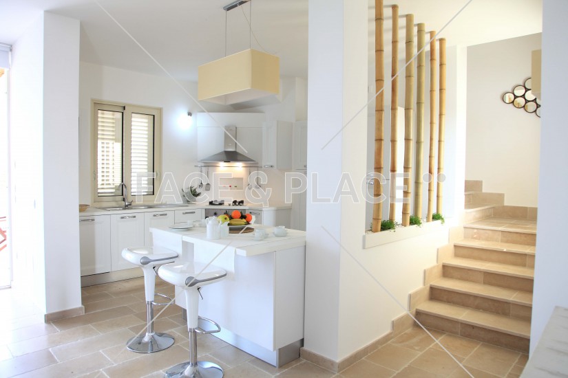 It has an entrance open space with lounge and kitchen area and two bedrooms, The upper floor consists of a suite from which there is direct access to a terrace built with wooden floor and balustrade glass. Also more from the suite you can access another terrace paved with "chianche" white of Salento.