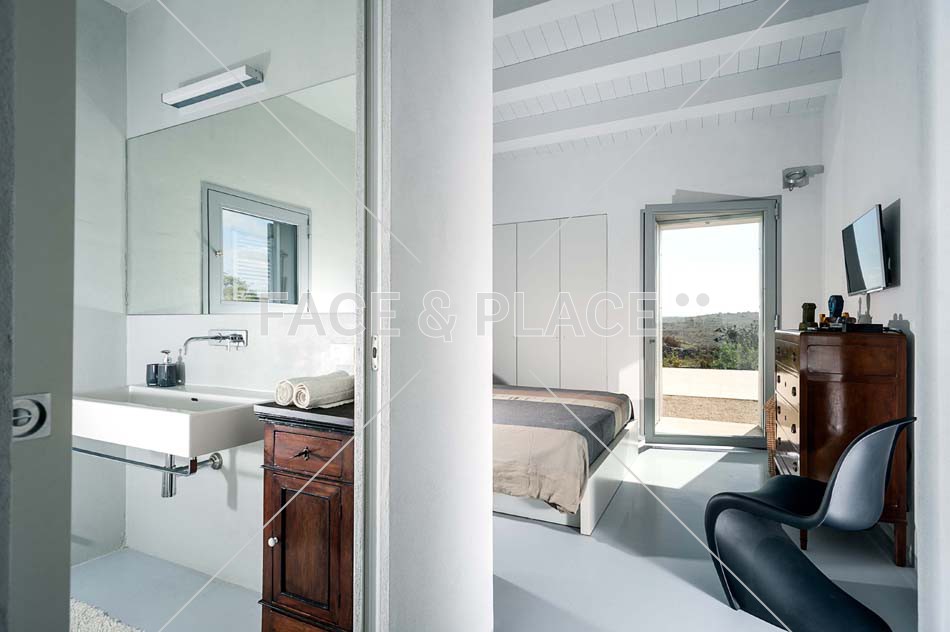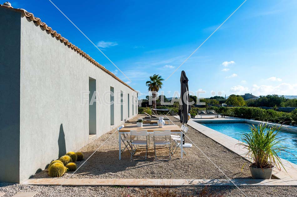 A modern villa surrounded by the typical Sicilian scenery. The interiors are developed on a single floor and they overlook the outdoor pool; the style is very clean, minimal and the house is very bright. The decor is a blend of modern furniture of gray and white tones and antique wooden furniture.