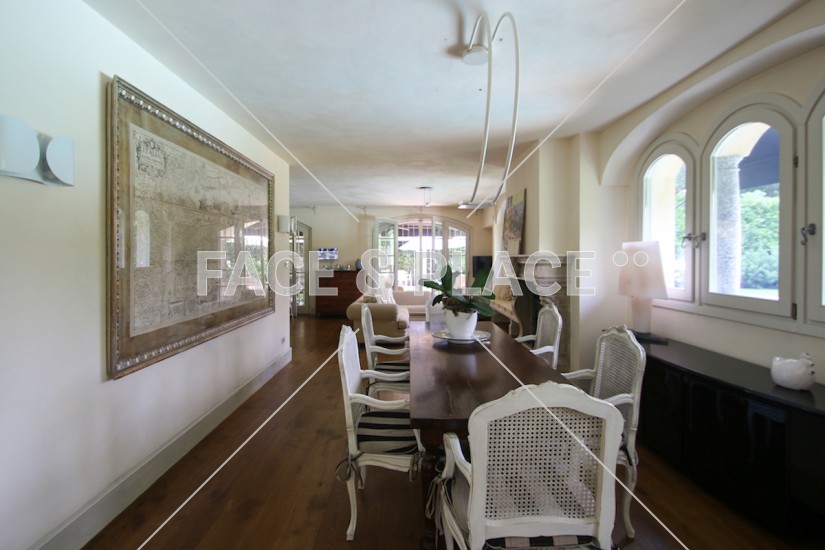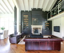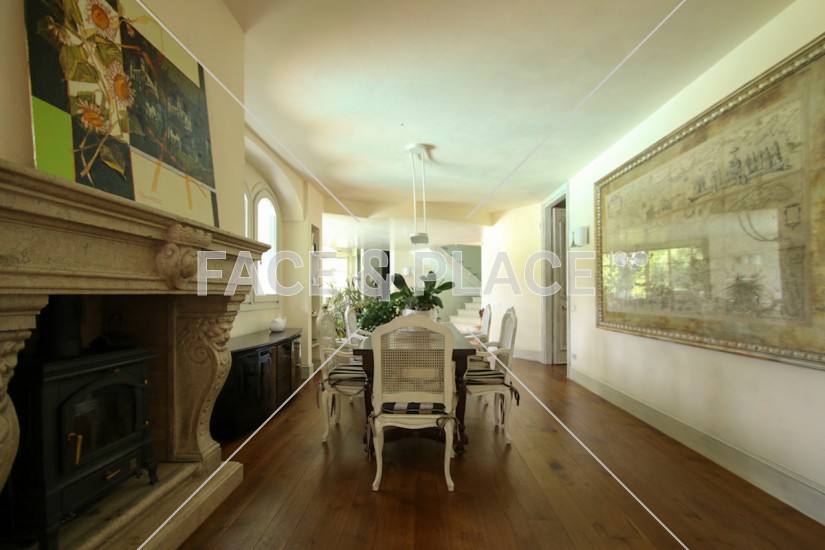 Ampio soppalco interno che si affaccia sul salone principale arredato con boiserie e dotato di camino, bow window e limonaia.
