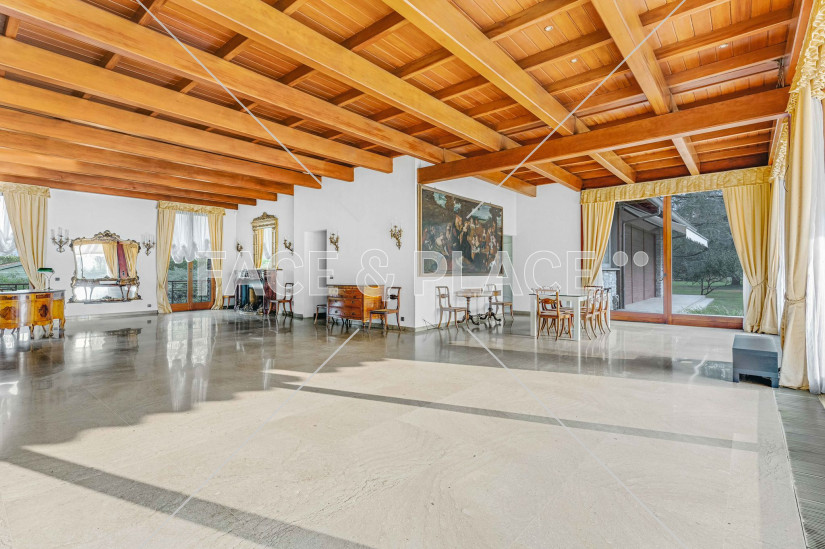 villa in stile americano anni 60 con piscina, circondata da un rigoglioso ed immenso giardino in stile classico. La particolarità e la bellezza di questa abitazione sono senz’altro le vetrate del soggiorno che si abbassano fino a scomparire, creando un incantevole open-space tra interno ed esterno.
