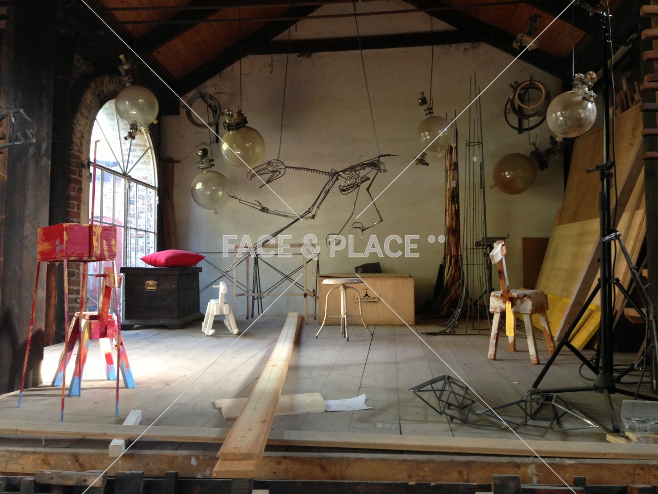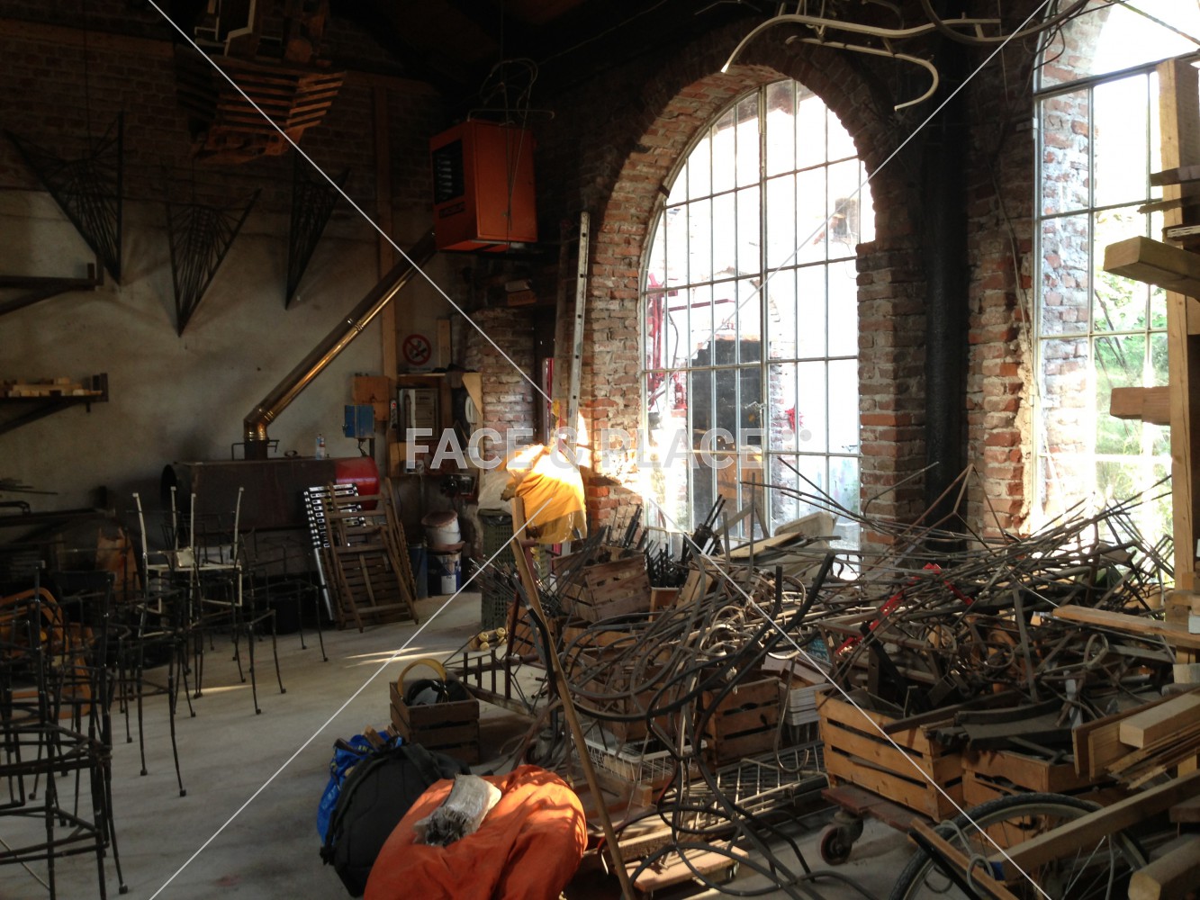 Laboratorio artigianale di grandi dimensioni all'interno di edificio rustico. Grandi vetrate illuminano gli interni in legno chiaro.