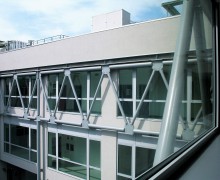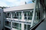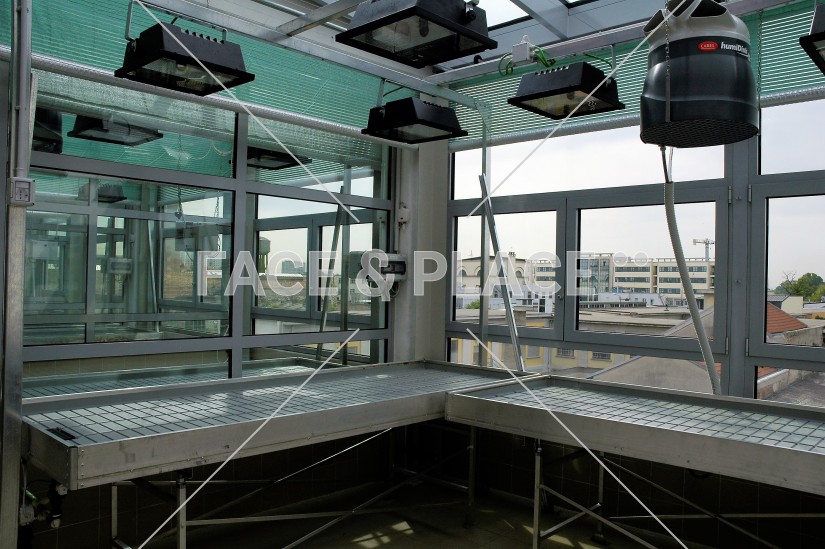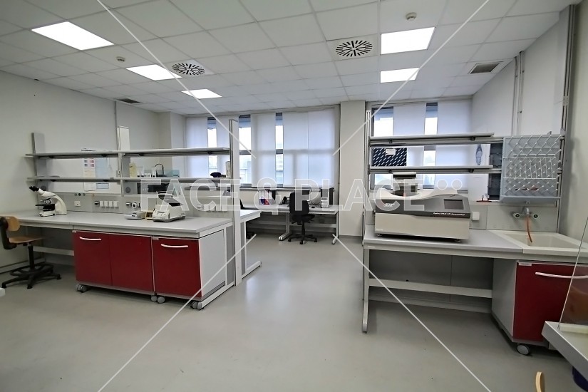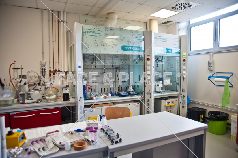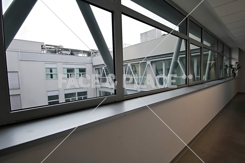 L'edificio si estende su tre livelli: il piano terreno ospita gli spazi comuni (reception, sala ristoro, infermeria, sale meeting, sala congressi, sala regia), ai piani superiori si alternano uffici e laboratori di ricerca.