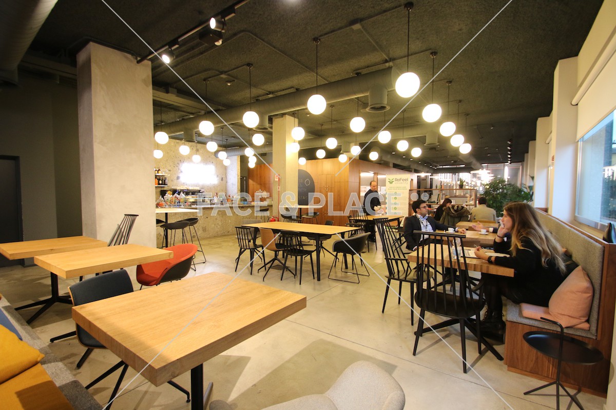 Spazio coworking su cinque livelli. Al piano terra zona accoglienza, bar e alcune postazioni di lavoro.